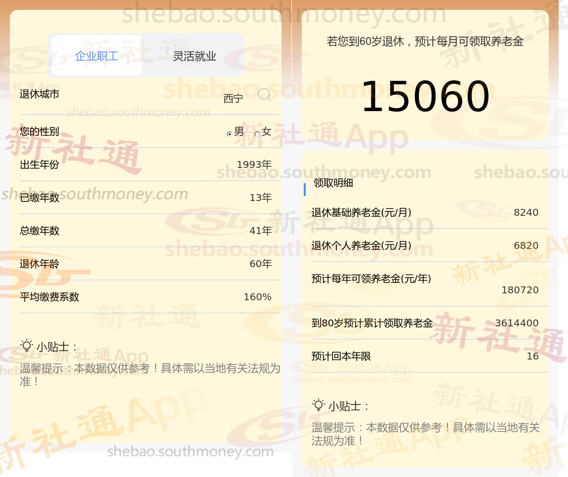 通过新社通APP-养老金计算所得:退休城市、出生年份、退休年龄、缴费系数都相同的情况下,社保缴费年限累计41年时,计算如下: