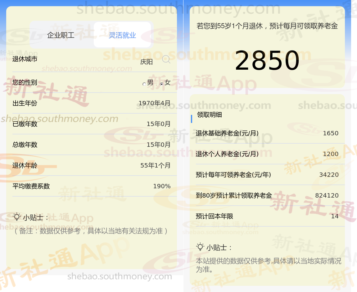 退休城市:庆阳,性别:女,出生年份:1970,总缴年数15年,缴费档次:190%,新社通app养老金计算器所得: