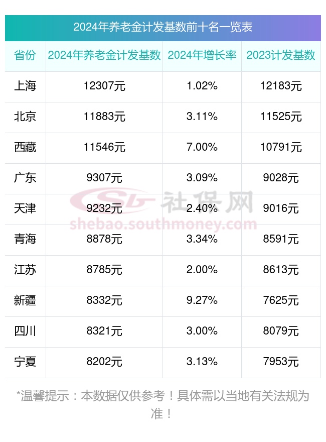 上海位列第一,养老金计发基数达到12307.00元,增长率为1.02%;