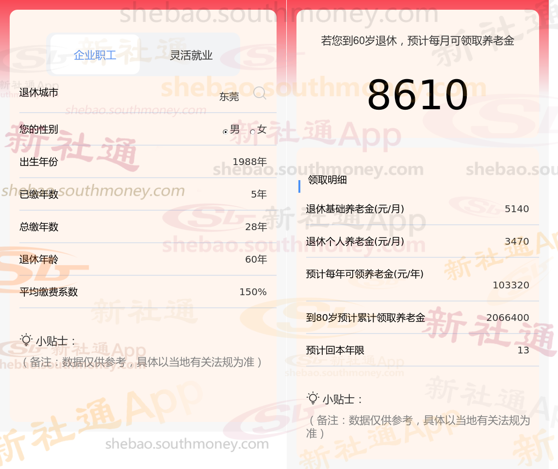 通过新社通APP-养老金计算所得:退休城市、出生年份、退休年龄、缴费系数都相同的情况下,社保缴费年限累计28年时,计算如下: