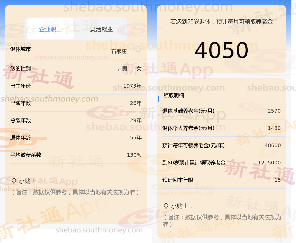 通过新社通APP-养老金计算所得:退休城市、出生年份、退休年龄、缴费系数都相同的情况下,社保缴费年限累计29年时,计算如下: