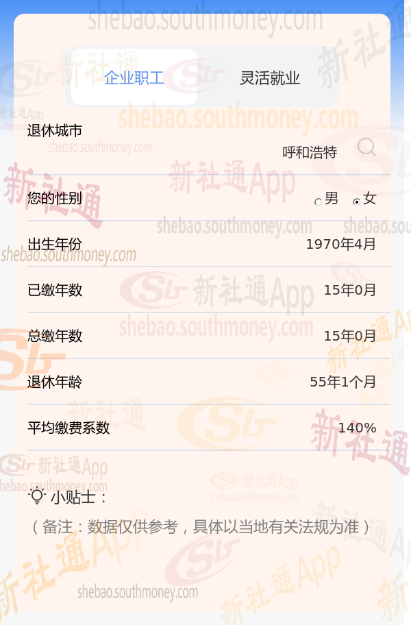 退休城市:呼和浩特,性别:女,出生年份:1970,总缴年数15年,缴费档次:140%为例,新社通app养老金计算器预设工资增长率等参数为3%。在此情境下,其退休后能领取的养老金数额需通过计算器精确得出,但基于上述条件,预计数额会相对较低。为获准确估算,建议康某使用计算工具按要求输入个人信息进行计算,具体数额依个人情况及当地法规而定。