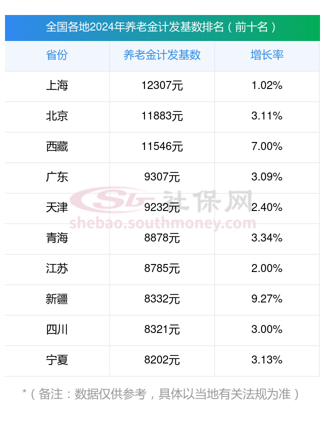 上海位列第一,养老金计发基数达到12307.00元,增长率为1.02%;