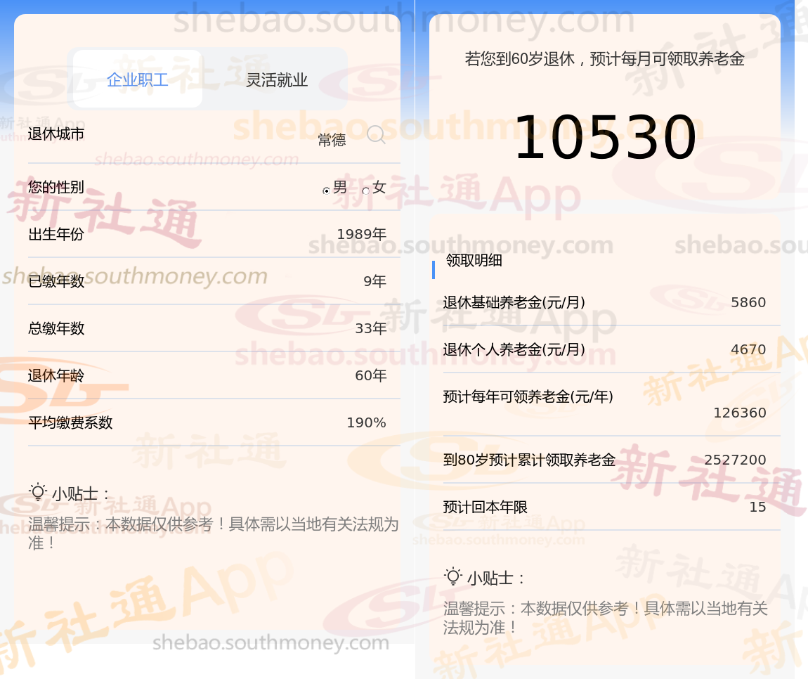 通过新社通APP-养老金计算所得:退休城市、出生年份、退休年龄、缴费系数都相同的情况下,社保缴费年限累计33年时,计算如下: