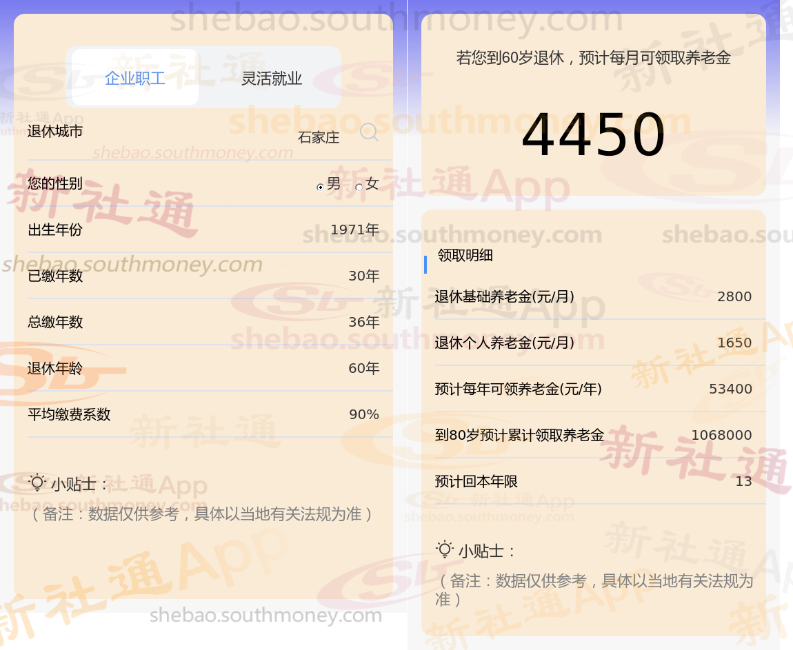 通过新社通APP-养老金计算所得:退休城市、出生年份、退休年龄、缴费系数都相同的情况下,社保缴费年限累计36年时,计算如下: