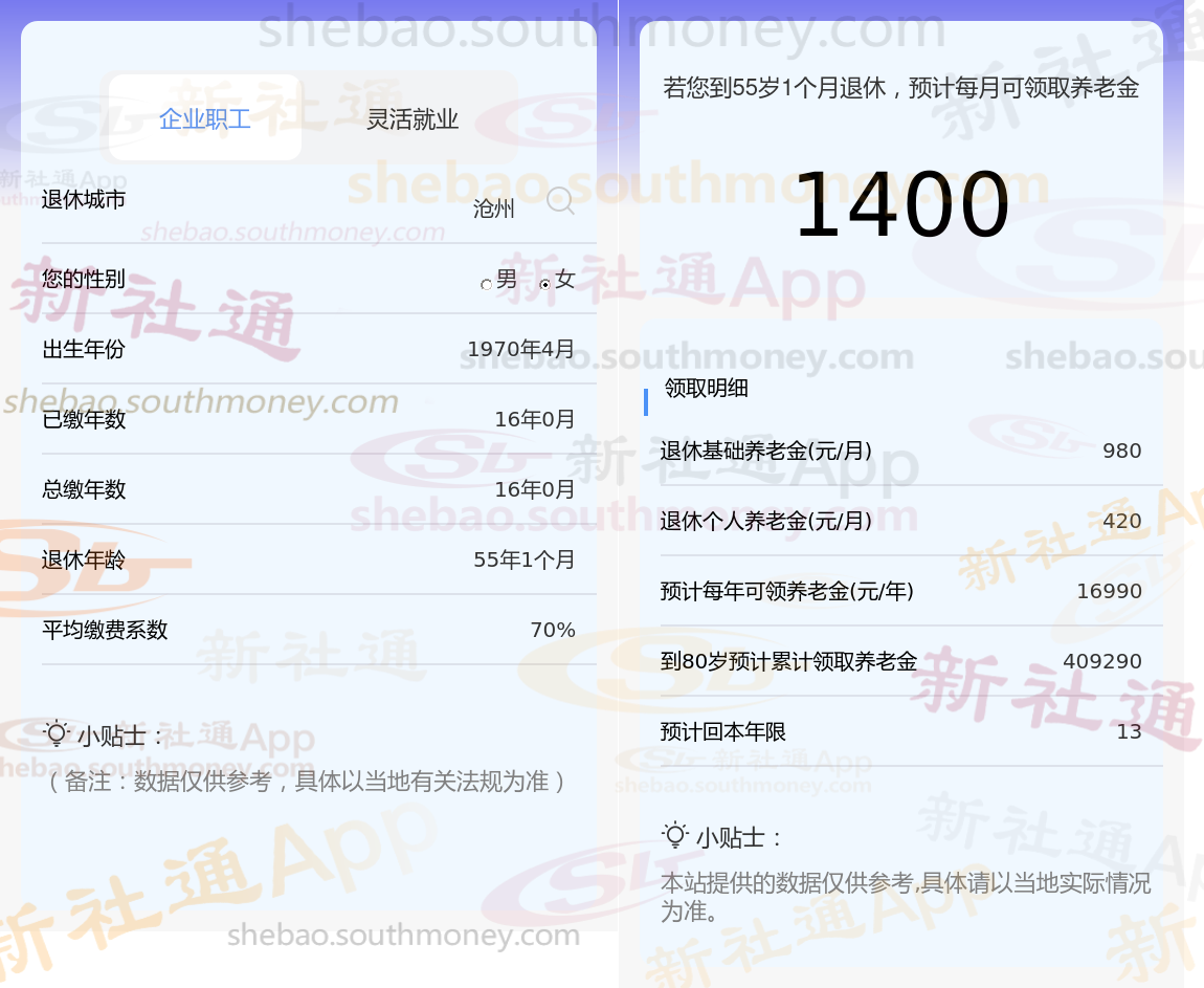 社保按70%档次缴费的王某,沧州城市退休,出生于1970年,工龄16年,女性。岁月流转,她终于迎来了自己的退休年龄。根据新社通app养老金在线计算器计算所得: