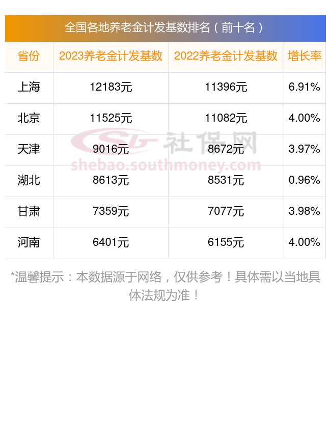 全国大部分地区都公布了2023年养老金计发基数,其余省份排名前几位具体是多少呢?在这里简单分享一下: