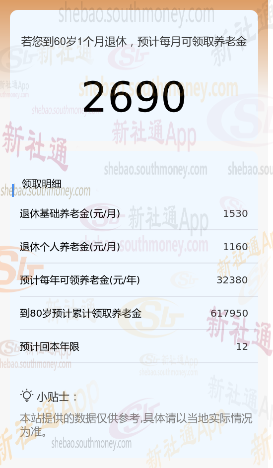 总养老金金额:两者合计,您每月可领取的养老金待遇总额为2690元/月。