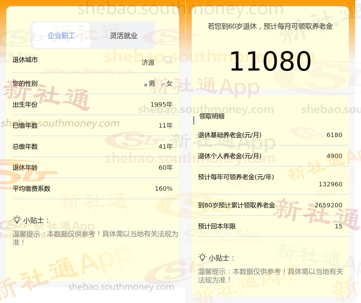 通过新社通APP-养老金计算所得:退休城市、出生年份、退休年龄、缴费系数都相同的情况下,社保缴费年限累计41年时,计算如下: