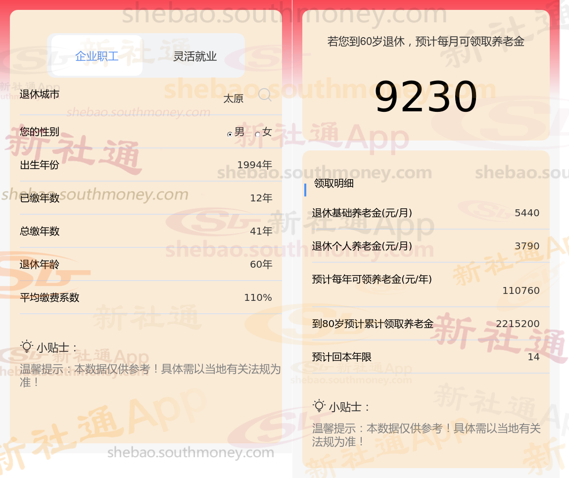 通过新社通APP-养老金计算所得:退休城市、出生年份、退休年龄、缴费系数都相同的情况下,社保缴费年限累计41年时,计算如下:
