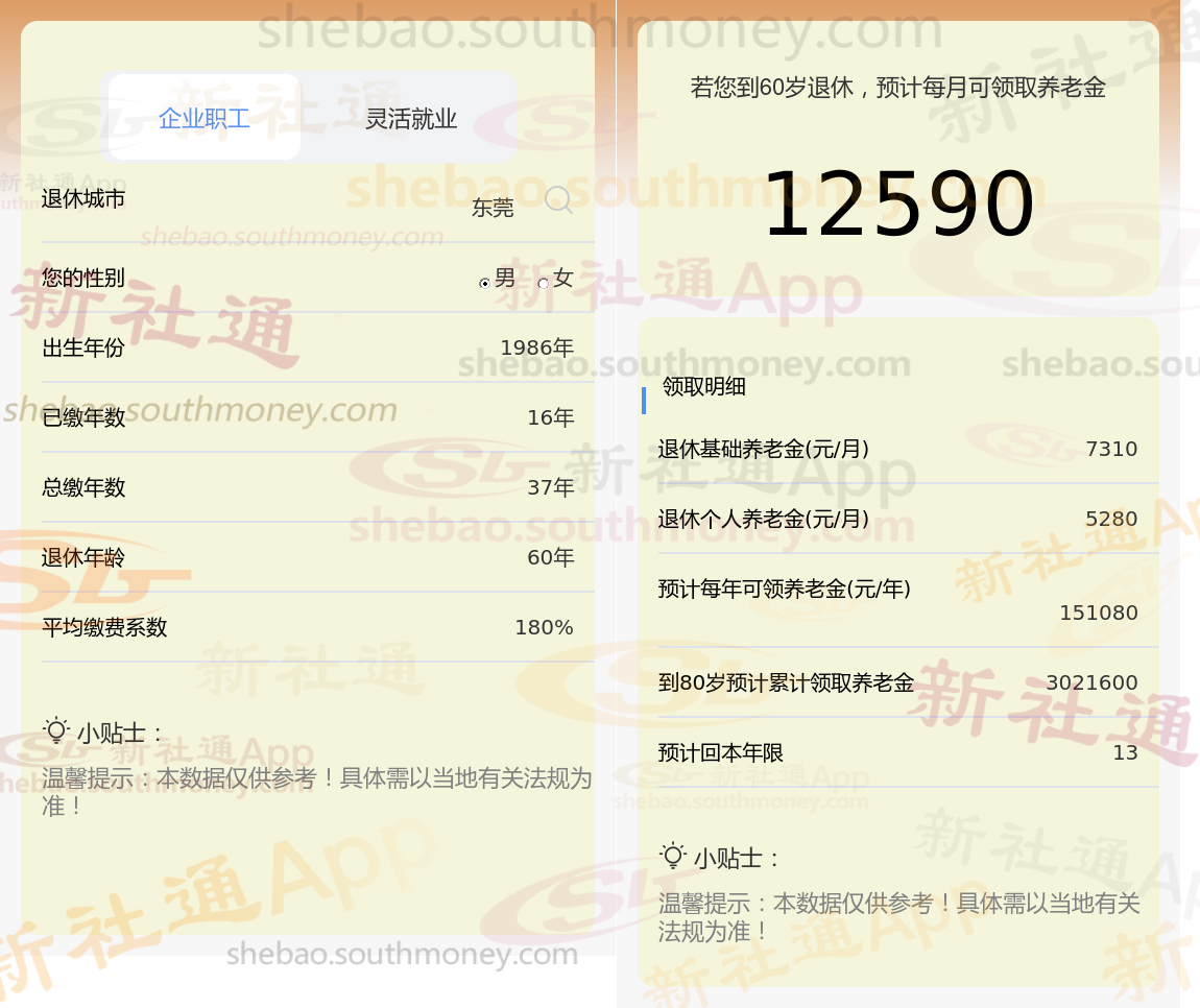 通过新社通APP-养老金计算所得:退休城市、出生年份、退休年龄、缴费系数都相同的情况下,社保缴费年限累计37年时,计算如下: