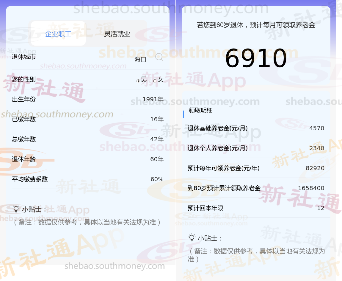通过新社通APP-养老金计算所得:退休城市、出生年份、退休年龄、缴费系数都相同的情况下,社保缴费年限累计42年时,计算如下:
