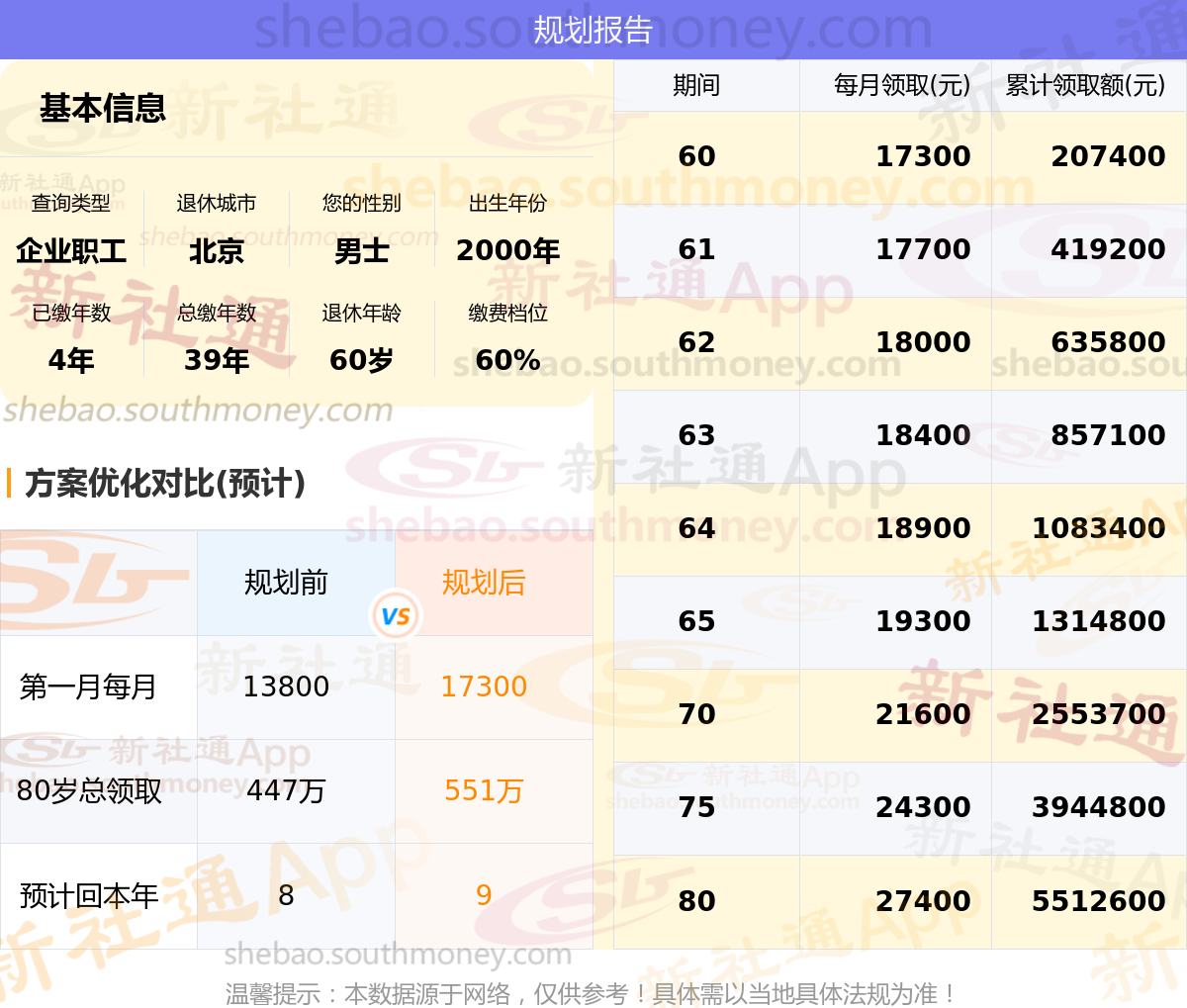规划前:参保城市:北京,性别:男士,出生年月:2000,已缴年限:4年,总缴年数:39年,退休年龄:60岁,缴费档位:60%。