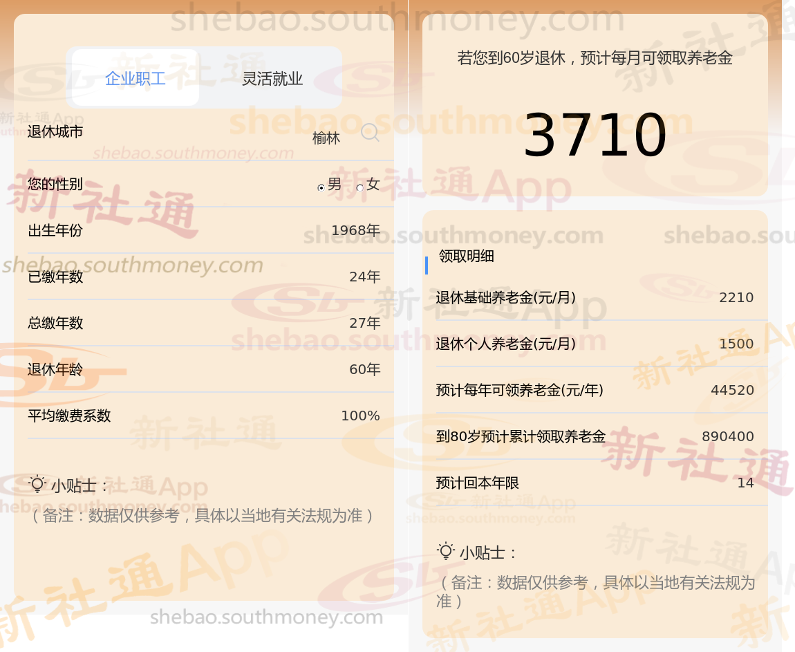 通过新社通APP-养老金计算所得:退休城市、出生年份、退休年龄、缴费系数都相同的情况下,社保缴费年限累计27年时,计算如下: