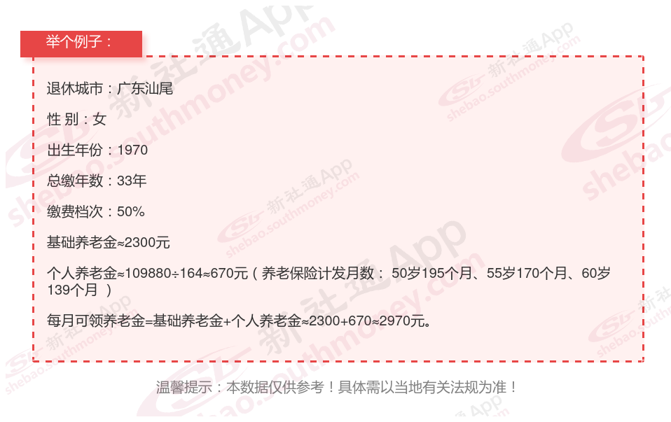 同事王某退休城市在广东汕尾,性别:女,出生年份:1970,总缴年数33年,缴费档次:50%