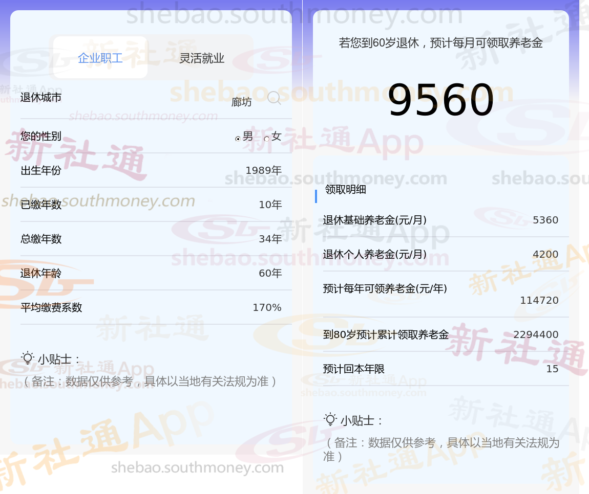 通过新社通APP-养老金计算所得:退休城市、出生年份、退休年龄、缴费系数都相同的情况下,社保缴费年限累计34年时,计算如下: