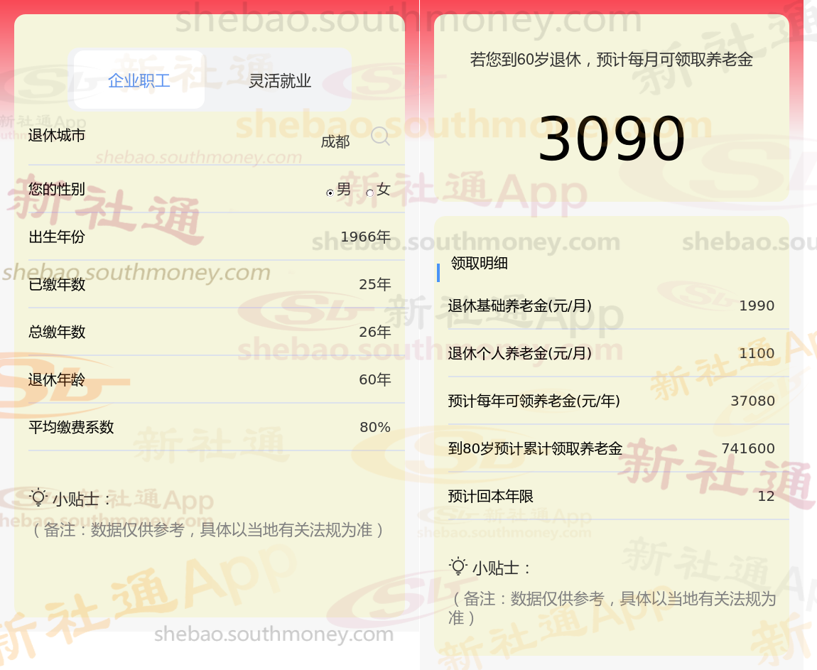 通过新社通APP-养老金计算所得:退休城市、出生年份、退休年龄、缴费系数都相同的情况下,社保缴费年限累计26年时,计算如下: