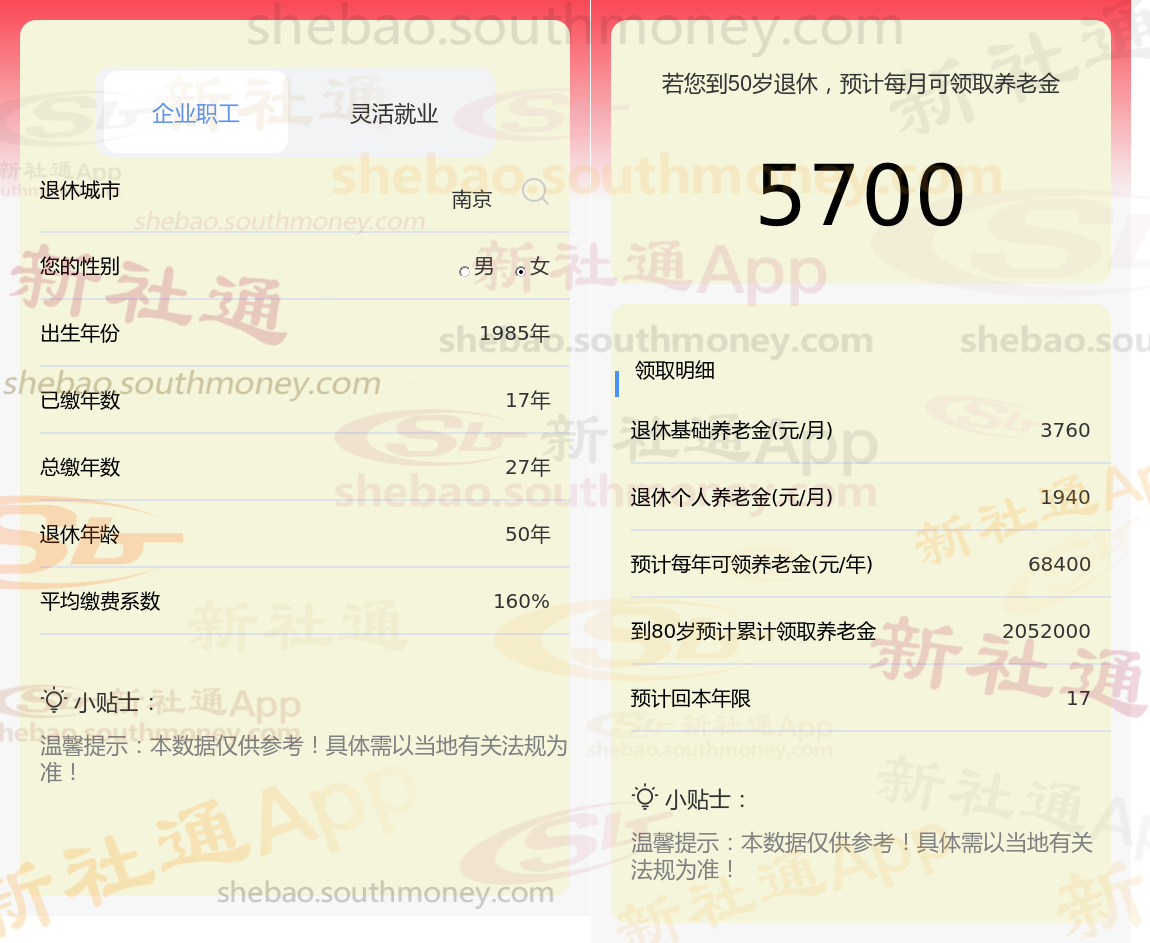 通过新社通APP-养老金计算所得:退休城市、出生年份、退休年龄、缴费系数都相同的情况下,社保缴费年限累计27年时,计算如下: