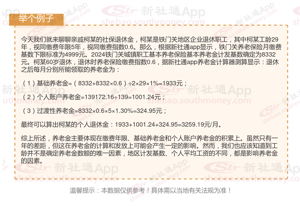 据新社通app获悉,铁门关养老保险是为了保证人们在老年时能够拥有稳定的经济来源,确保基本生活需求得到满足。然而,很多人并不清楚如何计算自己未来能够领取多少养老金?铁门关养老保险要交多少钱?下面,我们将详细介绍养老保险金的计算方法及在线计算器。
