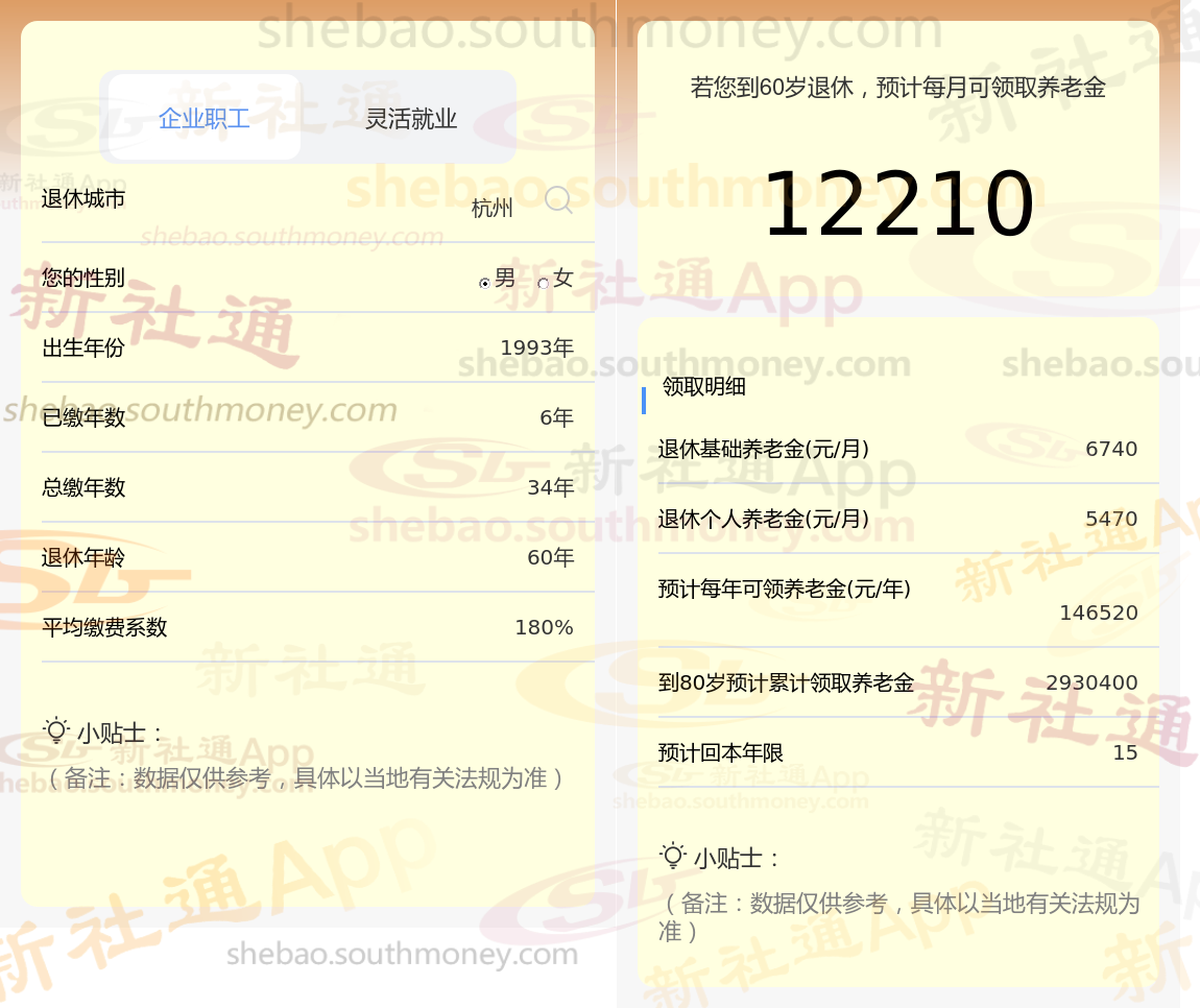 通过新社通APP-养老金计算所得:退休城市、出生年份、退休年龄、缴费系数都相同的情况下,社保缴费年限累计34年时,计算如下: