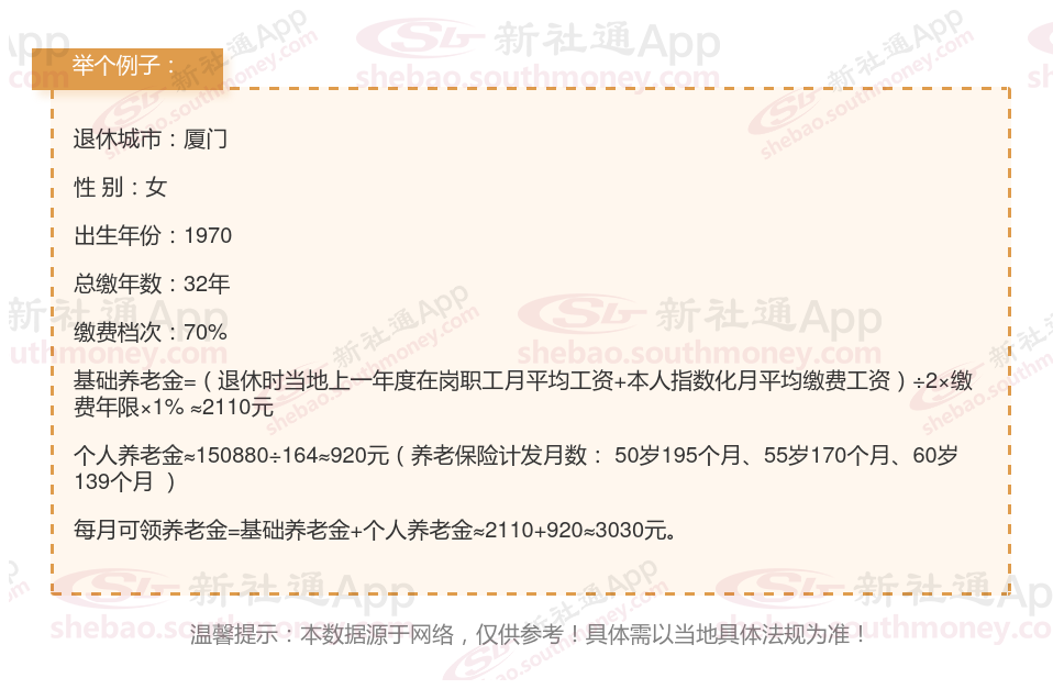 亲戚谢某退休城市在厦门,性别:女,出生年份:1970,总缴年数32年,缴费档次:70%