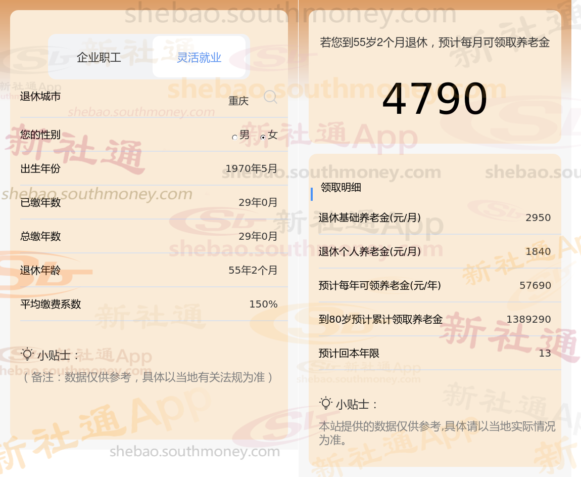 退休城市:重庆,性别:女,出生年份:1970,总缴年数29年,缴费档次:150%,新社通app养老金计算器所得: