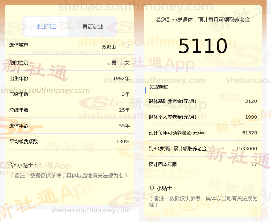 通过新社通APP-养老金计算所得:退休城市、出生年份、退休年龄、缴费系数都相同的情况下,社保缴费年限累计33年时,计算如下: