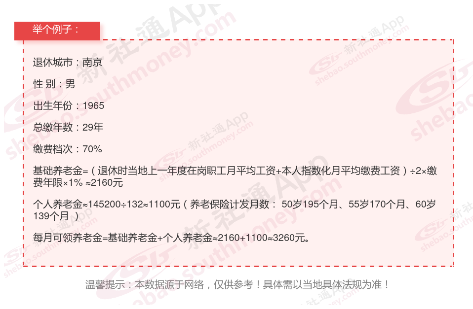 退休城市:南京,性别:男,出生年份:1965,总缴年数29年,缴费档次:70%