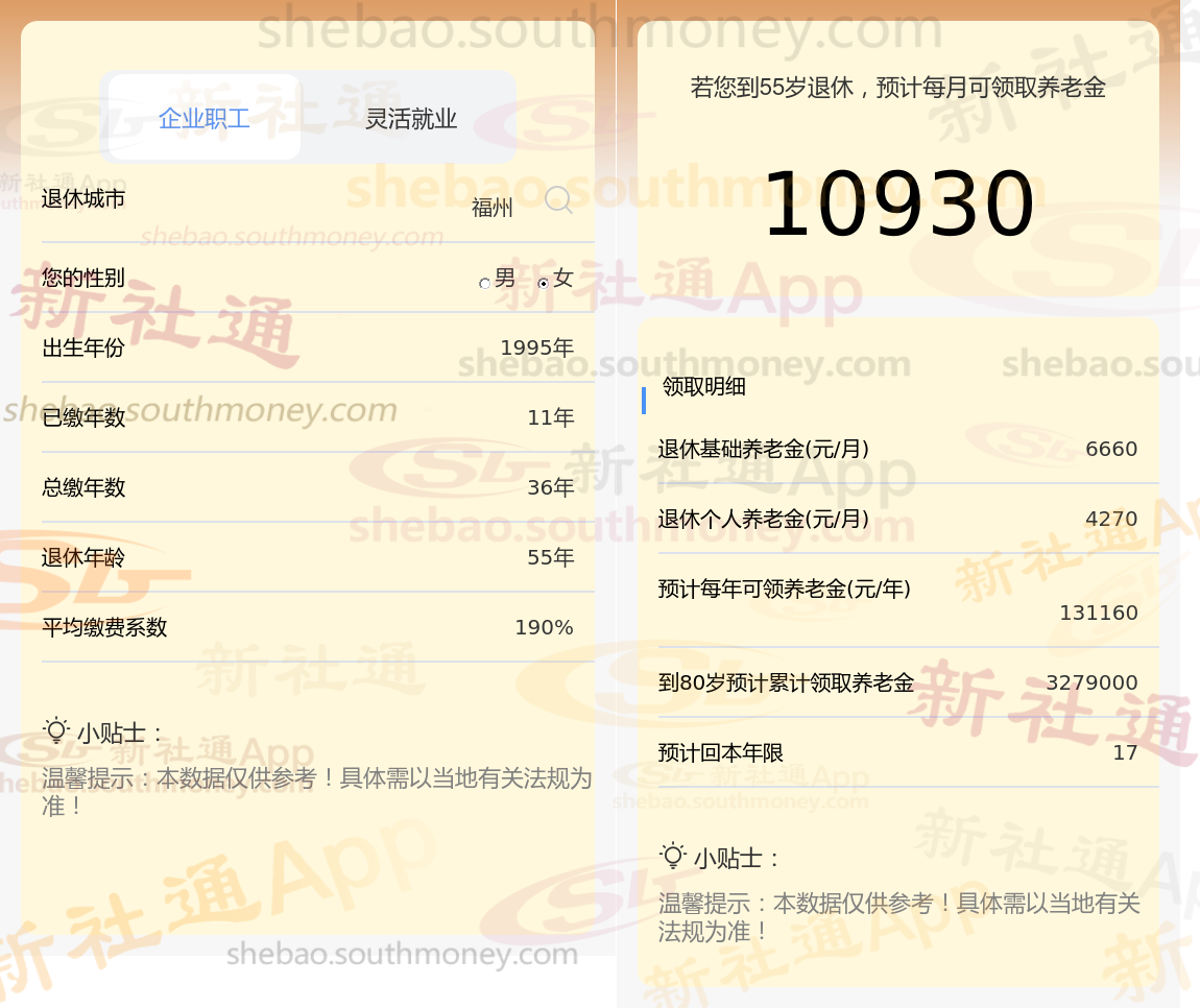 通过新社通APP-养老金计算所得:退休城市、出生年份、退休年龄、缴费系数都相同的情况下,社保缴费年限累计36年时,计算如下: