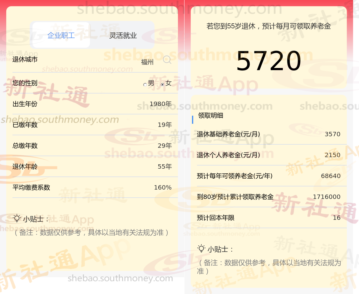 通过新社通APP-养老金计算所得:退休城市、出生年份、退休年龄、缴费系数都相同的情况下,社保缴费年限累计32年时,计算如下: