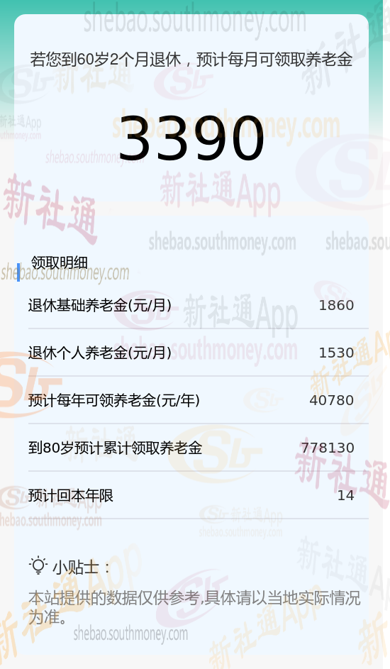 基于这些关键信息,我们使用新社通app养老金计算器对他未来的养老金进行了详细估算: