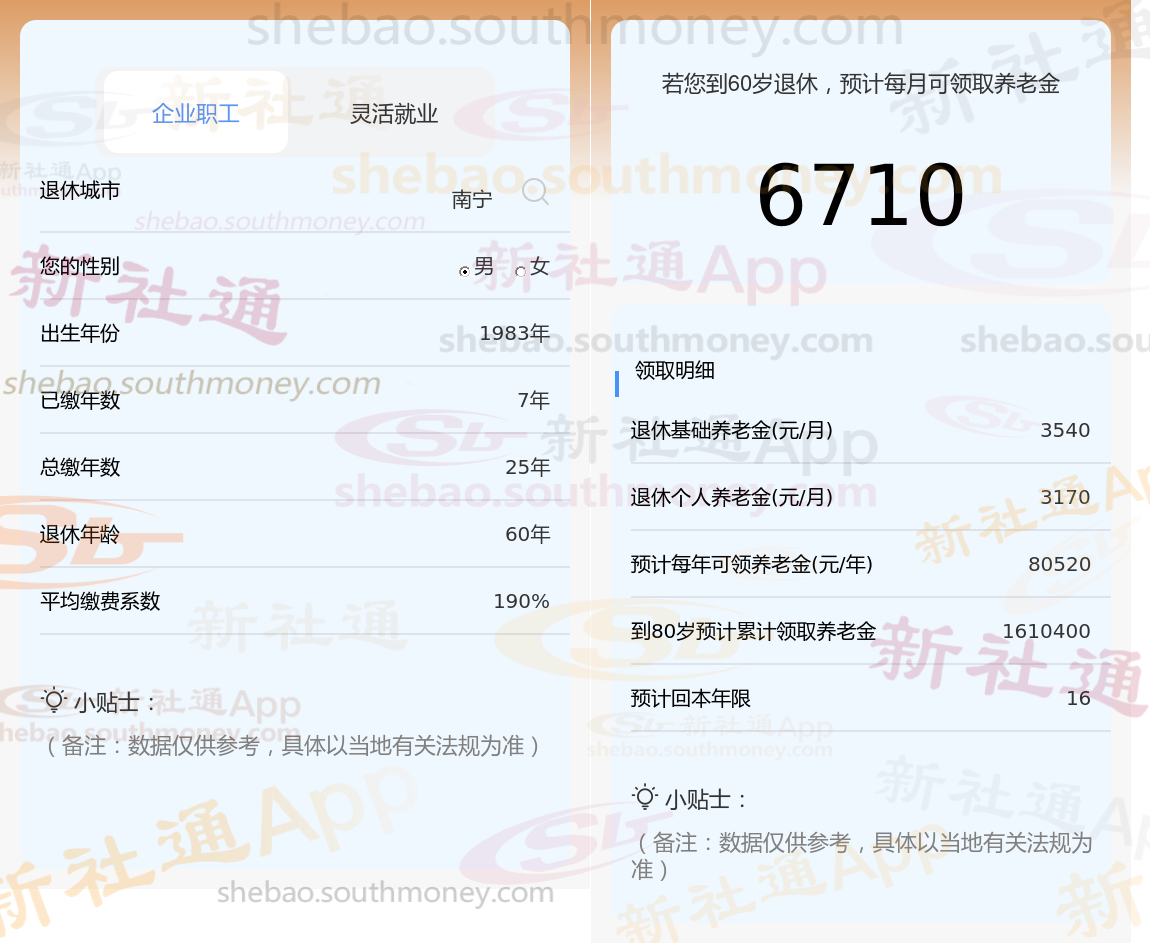 通过新社通APP-养老金计算所得:退休城市、出生年份、退休年龄、缴费系数都相同的情况下,社保缴费年限累计25年时,计算如下: