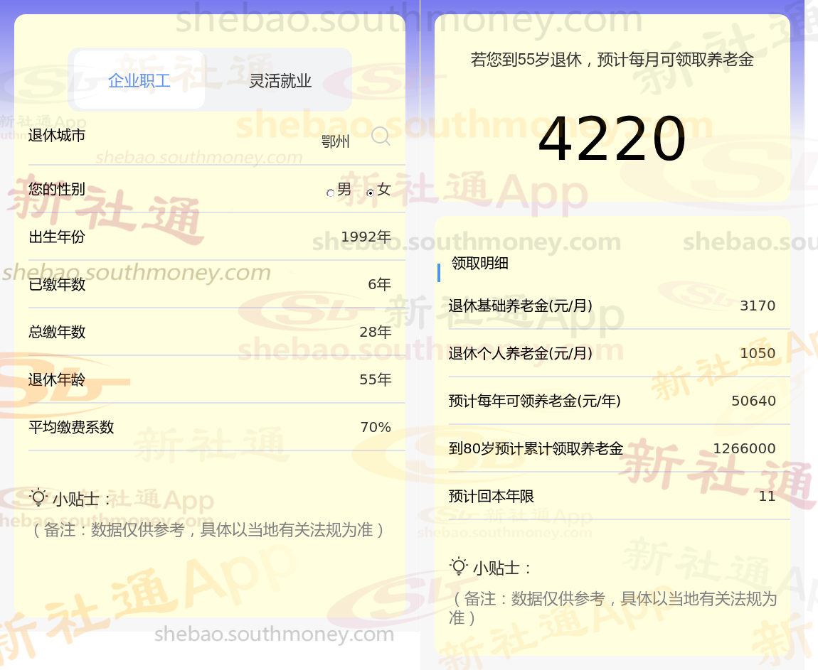 通过新社通APP-养老金计算所得:退休城市、出生年份、退休年龄、缴费系数都相同的情况下,社保缴费年限累计28年时,计算如下: