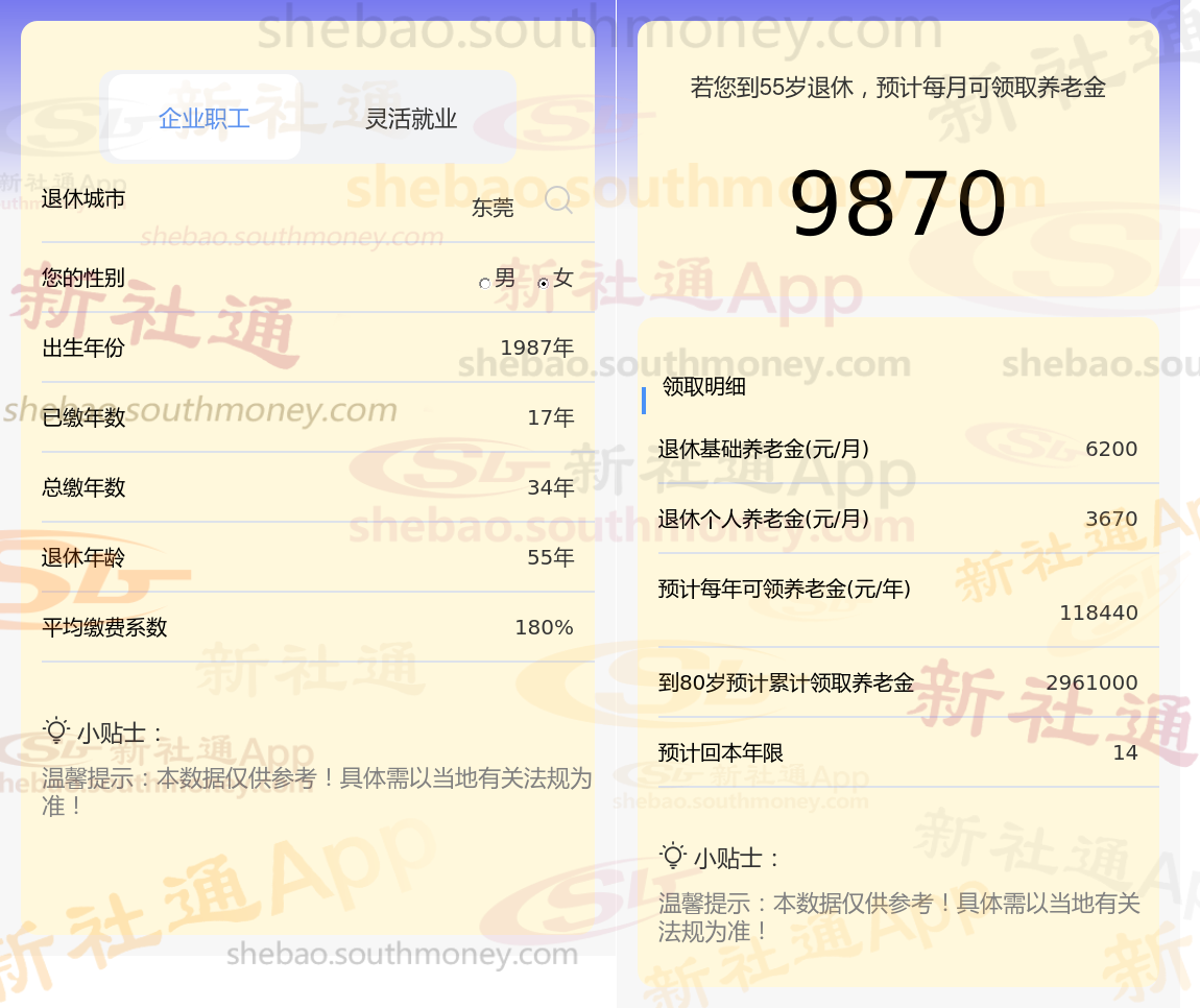 通过新社通APP-养老金计算所得:退休城市、出生年份、退休年龄、缴费系数都相同的情况下,社保缴费年限累计34年时,计算如下: