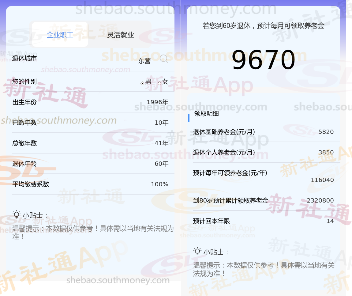 通过新社通APP-养老金计算所得:退休城市、出生年份、退休年龄、缴费系数都相同的情况下,社保缴费年限累计41年时,计算如下: