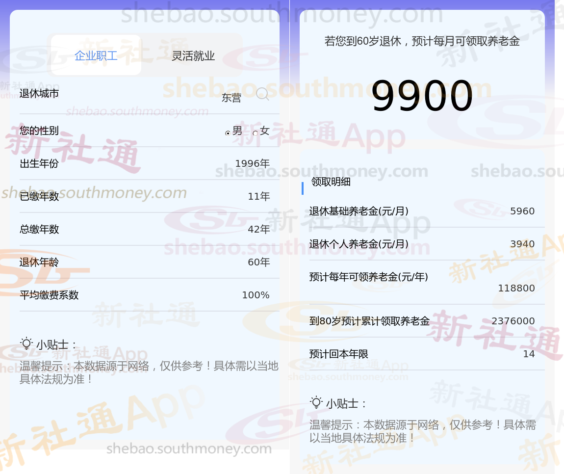 通过新社通APP-养老金计算所得:退休城市、出生年份、退休年龄、缴费系数都相同的情况下,社保缴费年限累计42年时,计算如下: