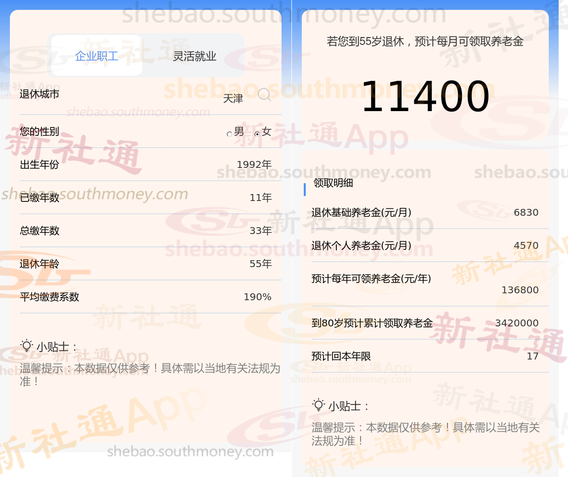 通过新社通APP-养老金计算所得:退休城市、出生年份、退休年龄、缴费系数都相同的情况下,社保缴费年限累计33年时,计算如下: