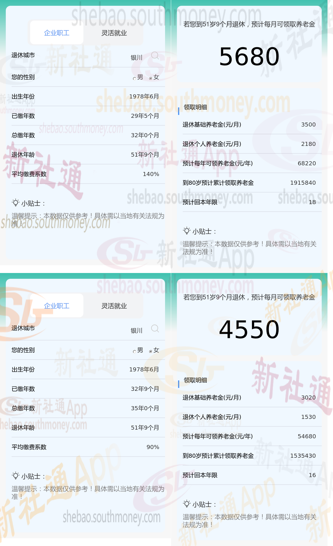 新社通app养老金计算器,轻松测算您的养老金!:两者相差5680-4550=1130元。