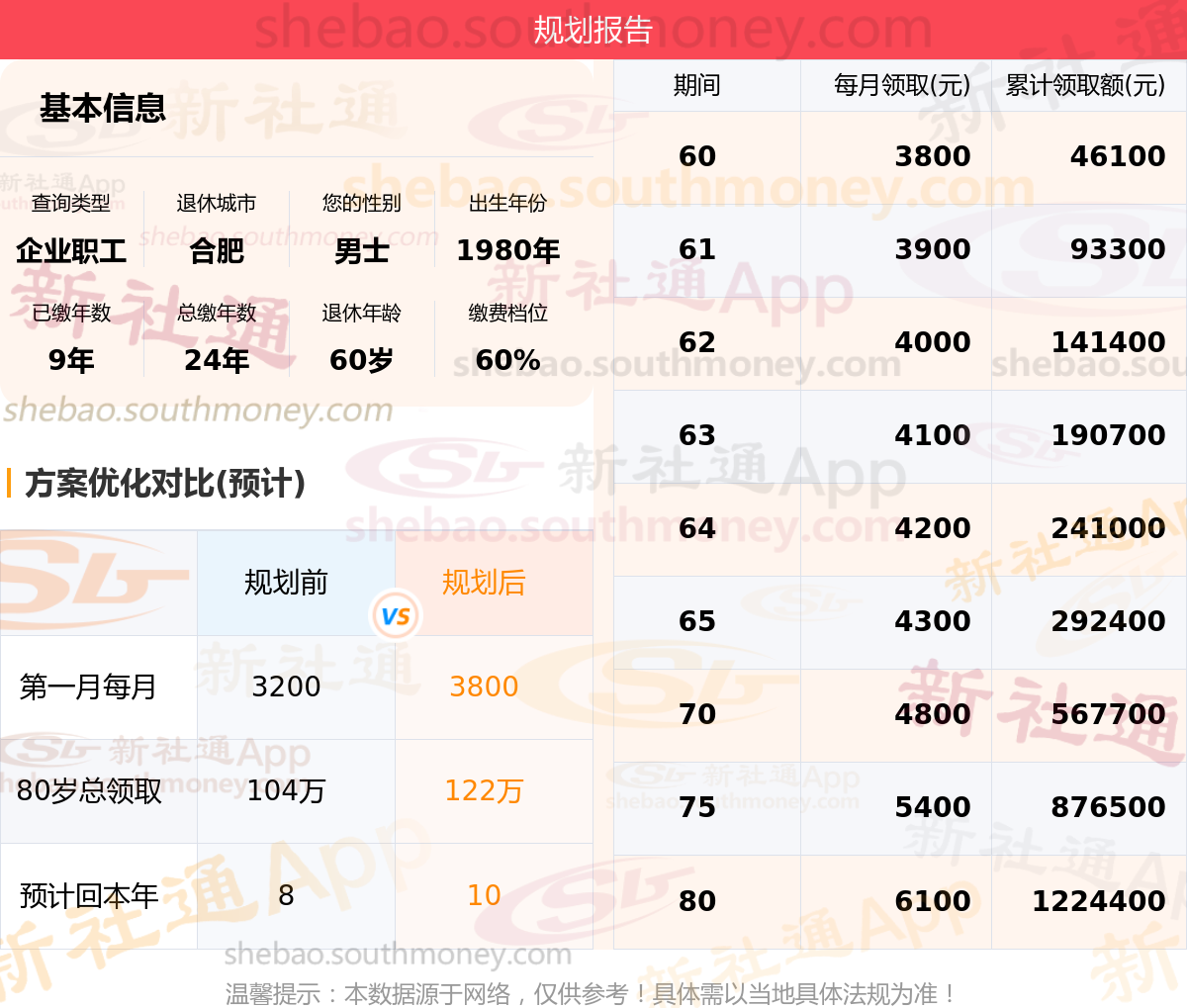 规划前:60岁第一个月约领3200元,新社通APP-养老金规划后:60岁第一个月约领3800元