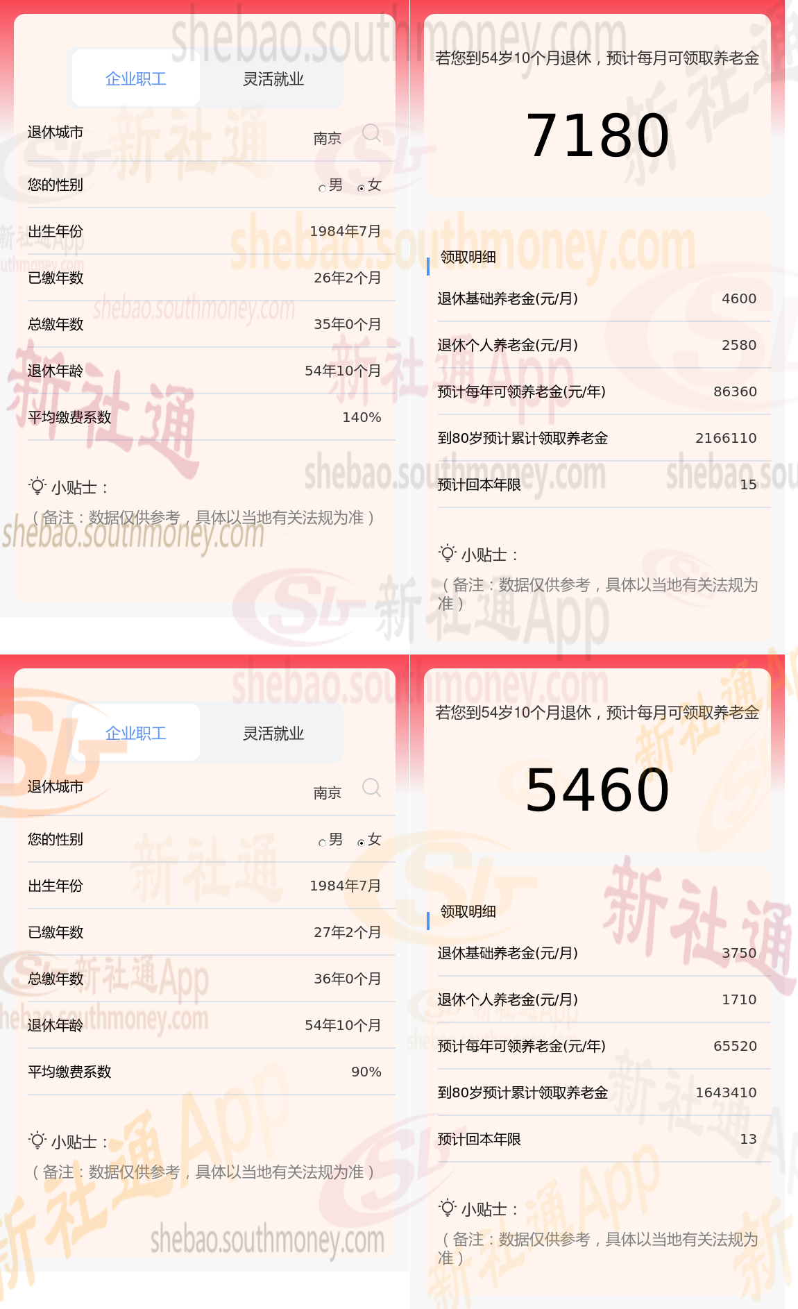 老郑退休城市:江苏南京,缴费年限:36年,退休年龄:54周岁,缴费系数:90%