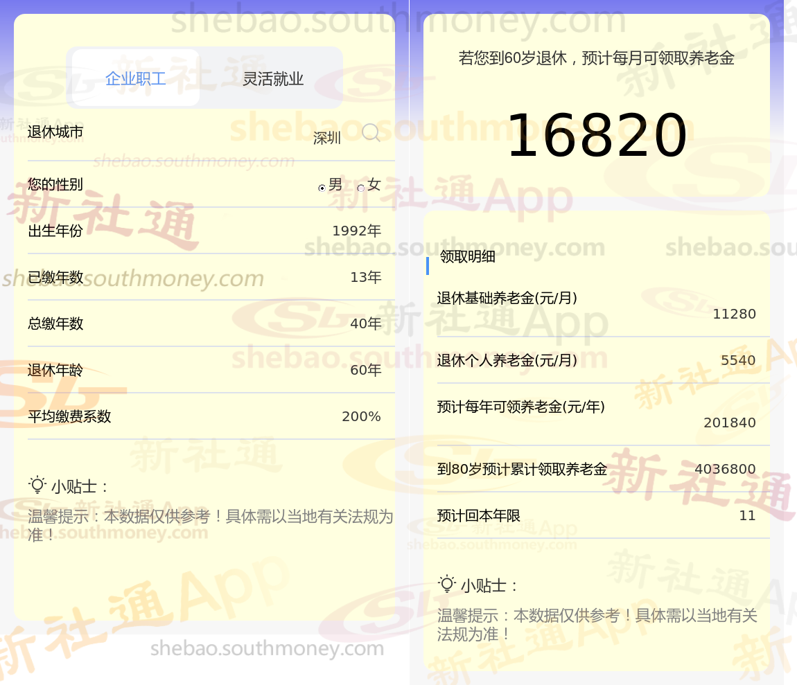 通过新社通APP-养老金计算所得:退休城市、出生年份、退休年龄、缴费系数都相同的情况下,社保缴费年限累计40年时,计算如下: