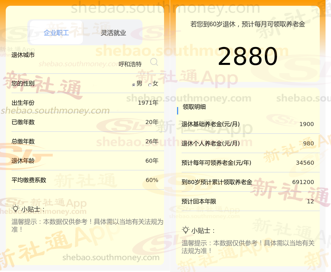 通过新社通APP-养老金计算所得:退休城市、出生年份、退休年龄、缴费系数都相同的情况下,社保缴费年限累计26年时,计算如下: