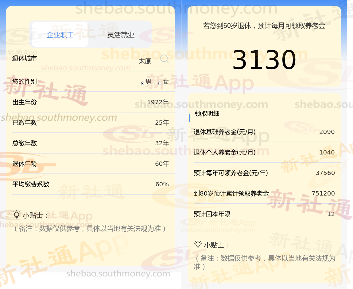 通过新社通APP-养老金计算所得:退休城市、出生年份、退休年龄、缴费系数都相同的情况下,社保缴费年限累计32年时,计算如下: