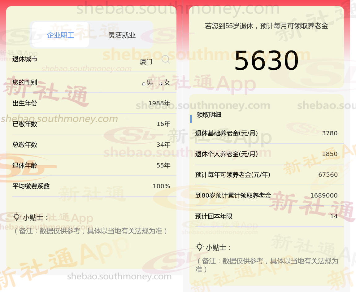 通过新社通APP-养老金计算所得:退休城市、出生年份、退休年龄、缴费系数都相同的情况下,社保缴费年限累计34年时,计算如下: