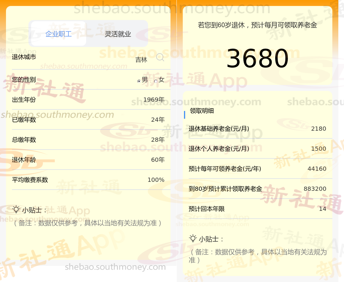 通过新社通APP-养老金计算所得:退休城市、出生年份、退休年龄、缴费系数都相同的情况下,社保缴费年限累计30年时,计算如下:
