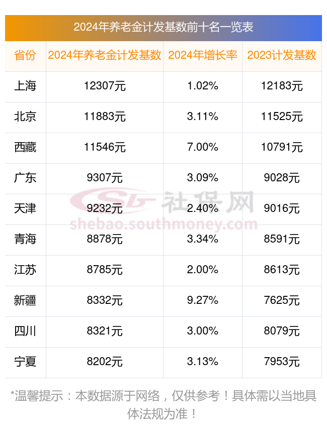 上海位列第一,养老金计发基数达到12307.00元,增长率为1.02%;