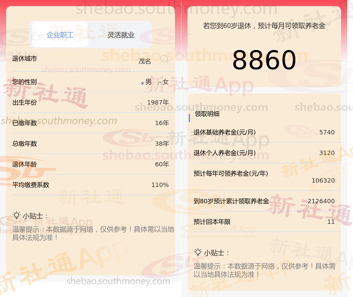 通过新社通APP-养老金计算所得:退休城市、出生年份、退休年龄、缴费系数都相同的情况下,社保缴费年限累计38年时,计算如下: