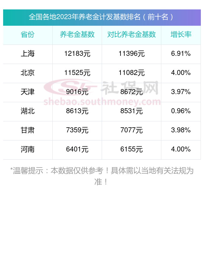 据新社通app显示,2024年上海位列第一位,养老金计发基数达到12307.00元,增长率为1.02%;北京排名第二,养老金计发基数为11883.00元,增长率为3.11%;西藏排名第三,养老金计发基数11546.00元,增长率为7.00%。排名前10的还有:广东、天津、青海、江苏、湖北、新疆、四川。