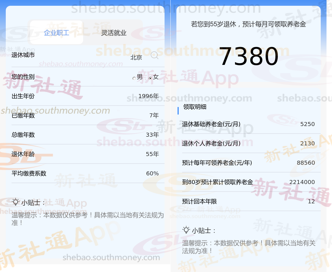 通过新社通APP-养老金计算所得:退休城市、出生年份、退休年龄、缴费系数都相同的情况下,社保缴费年限累计33年时,计算如下: