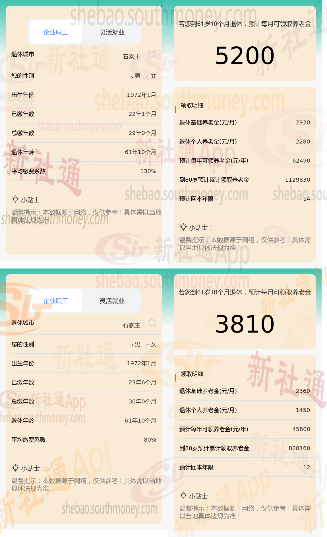 老王退休城市:石家庄,缴费年限30年,退休年龄61周岁,但是按80%缴纳社保。